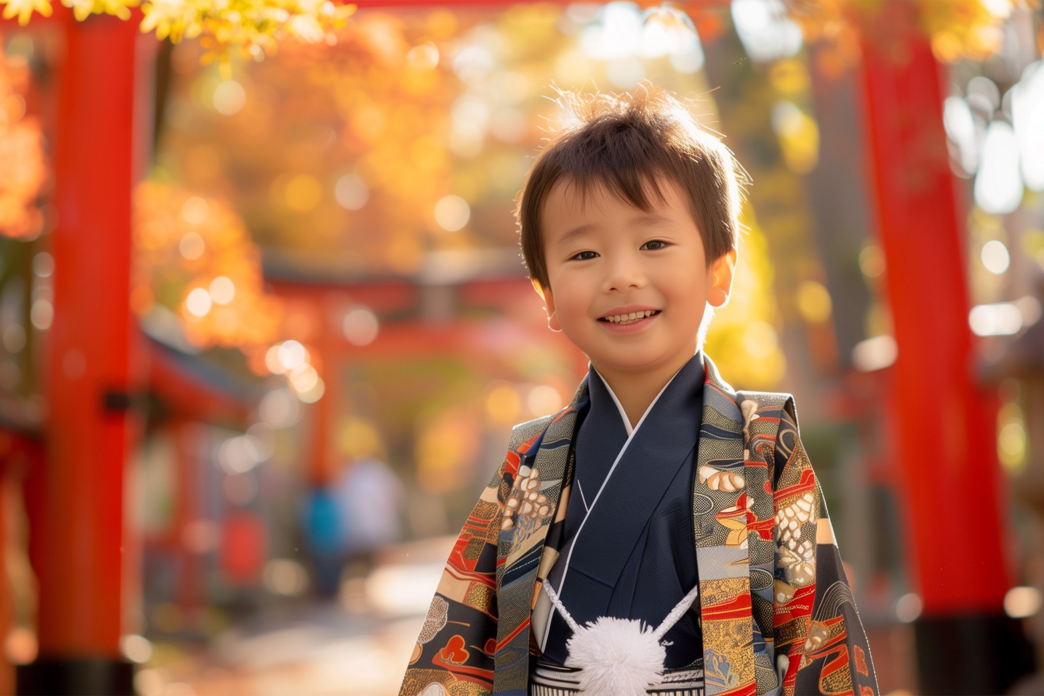晴れ着に身を包んだ子どもたちと、朱塗りの鳥居や紅葉が織りなす風景は、日本の季節の美を象徴する一枚です。
