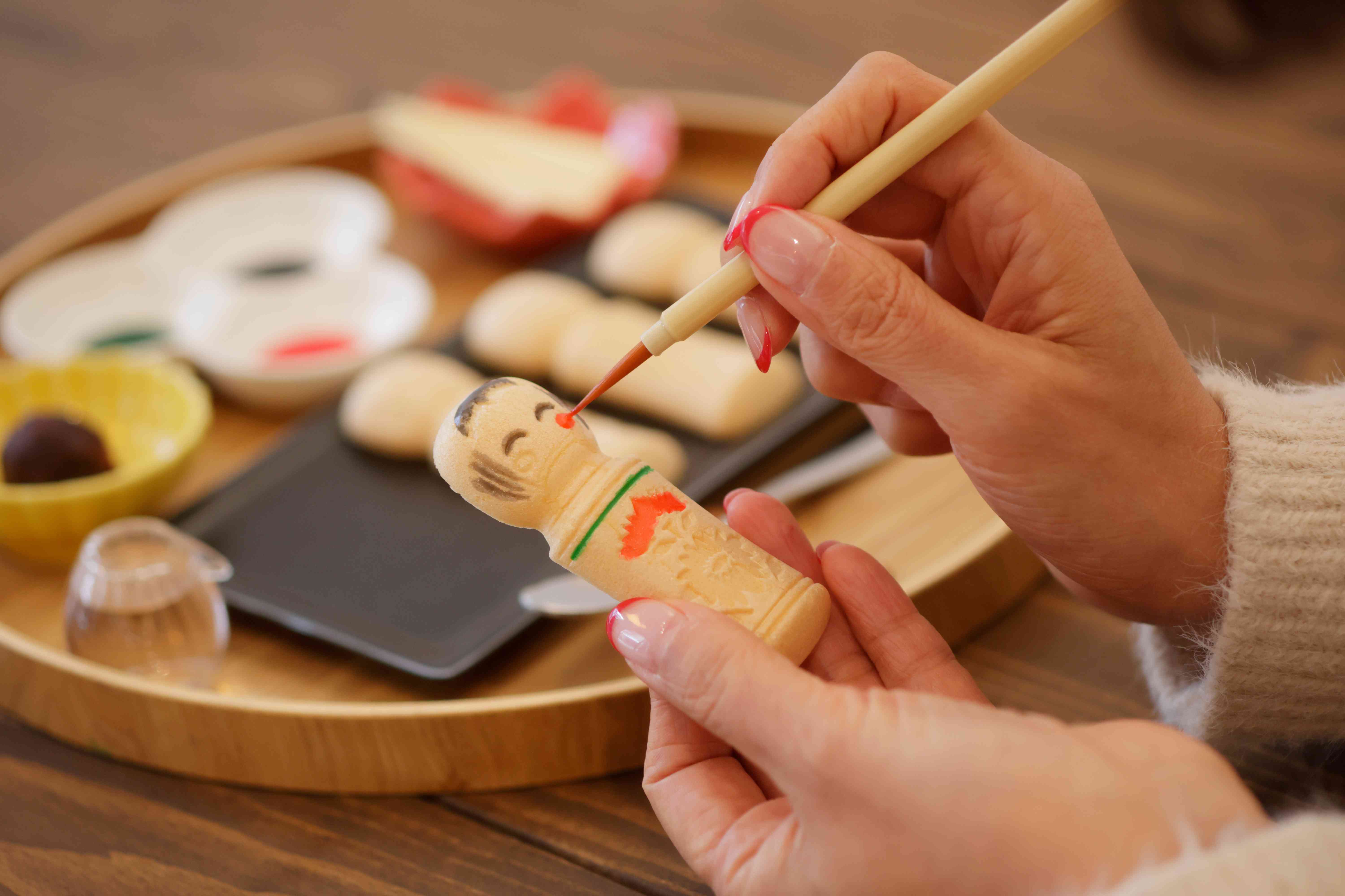 店内のイートインスペースを利用して、こけしの形をした最中に絵付け体験が楽しめます。絵付けをした最中には、餡・栗・アイスなどの具材も入れられます。