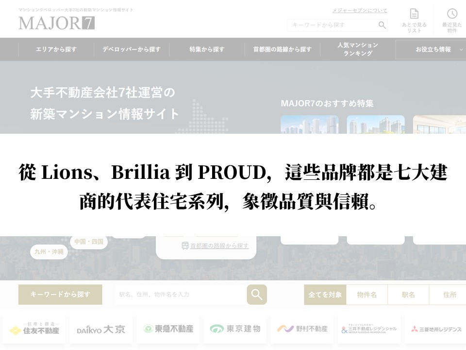 In Japan’s real estate sector, these seven companies are recognized as the leaders in residential development, with numerous well-known projects in major cities such as Tokyo, Osaka, and Yokohama.