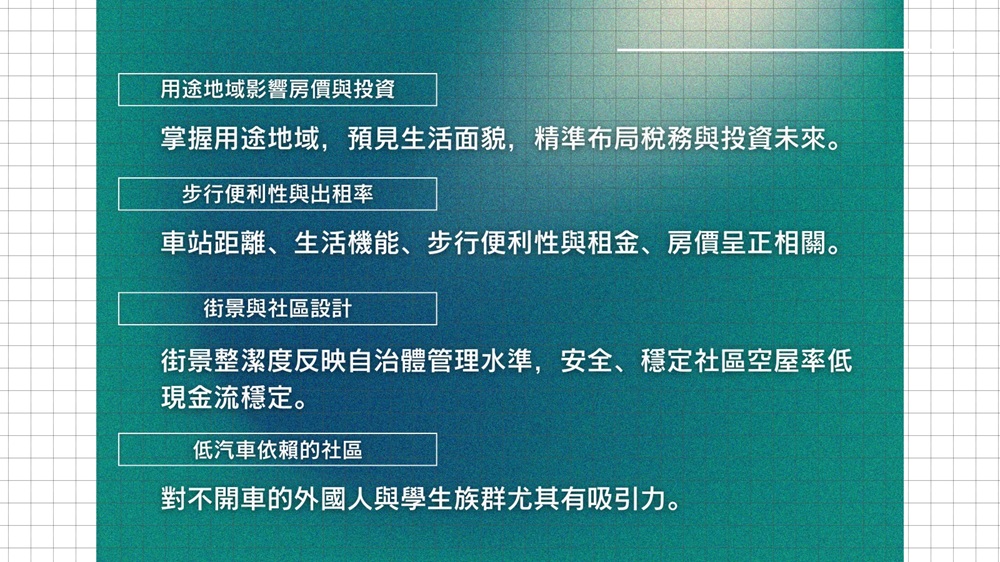 對房地產投資人而言,這些城市設計細節不只是生活上的加分項,更是影響物件出租率、租金水準與保值性的核心因素。