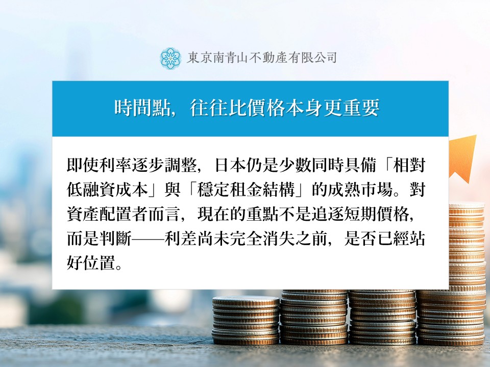 當多數市場的融資成本與不動產投報率之間已趨近甚至倒掛,日本仍維持著一段可計算、可承受的利差。