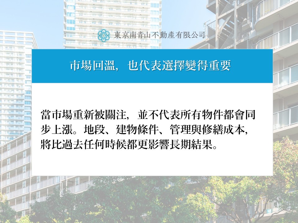 修繕成本與管理體制: 隨著日本工資漲幅,建築維護與管理費的支出也在上升。在選擇物件時,必須詳閱長期的修繕計畫書,避免未來隱藏支出侵蝕獲利。
